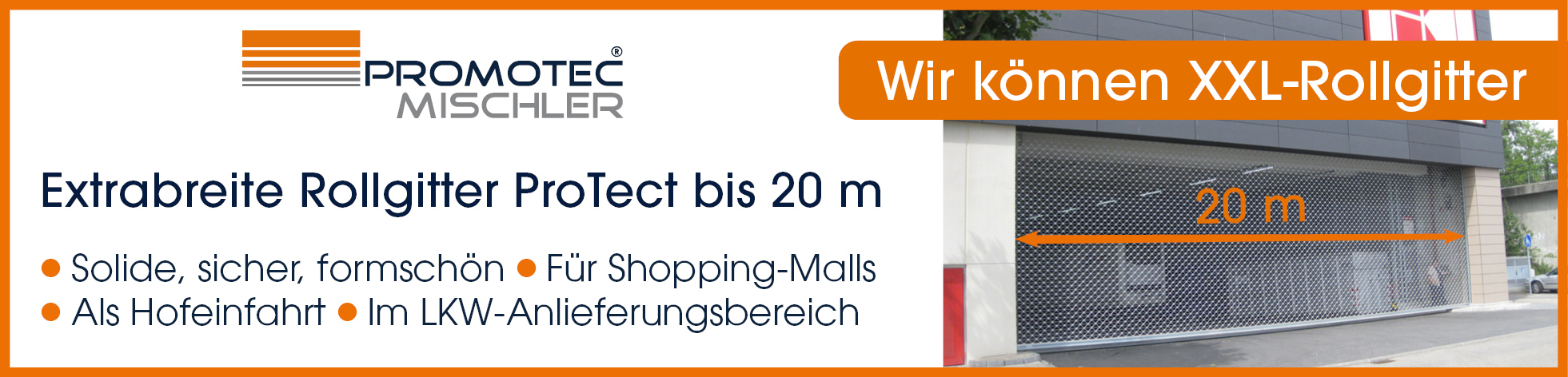 Ob als Sicherungsabschlüsse in Shopping Malls und für Shop-in-Shop-Systeme, für Anlieferzonen in Einkaufszentren mit Einfahrten für LKW, öffentliche Bereiche in Flughäfen und Bahnhöfen oder in Hangars: Überall dort, wo besonders große Öffnungen zuverlässig geschützt werden müssen, kommen Rollgitter von Promotec Mischler zum Einsatz. Mit Breiten von bis zu 20 Metern bietet die ProTect-Baureihe individuelle Lösungen für alle extrabreiten Sonderanwendungen, bei denen eine gute Durchlüftung und Lichteinfall gewünscht sind, die zugleich aber ein Höchstmaß an Sicherheit bieten.