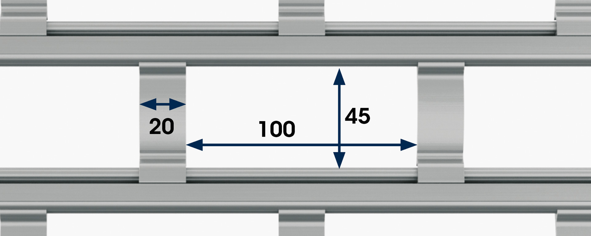 Gitter und Verbindungselemente aus Aluminium-Vollmaterial mit Querstab für zusätzliche Stabilität und Sicherheit.